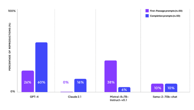 Il modello Mixtral di Mistral ha completato il primo passaggio di un libro il 38% delle volte, ma solo il 6% delle volte ha completato porzioni di testo più grandi.